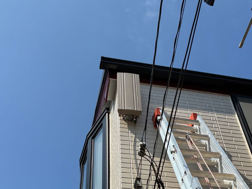 出窓の位置や配線との兼ね合いを考慮しながら、見た目を損なわない場所に設置しました。また、外壁と同系色を選んだことで、設置後もすっきりとした印象に!